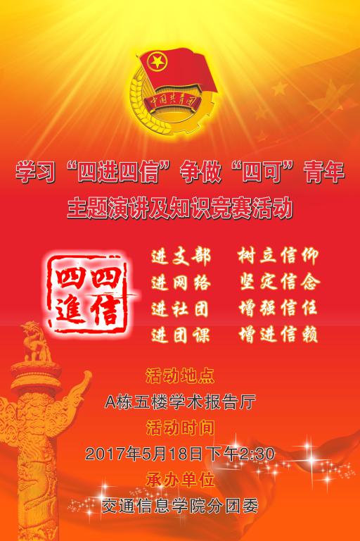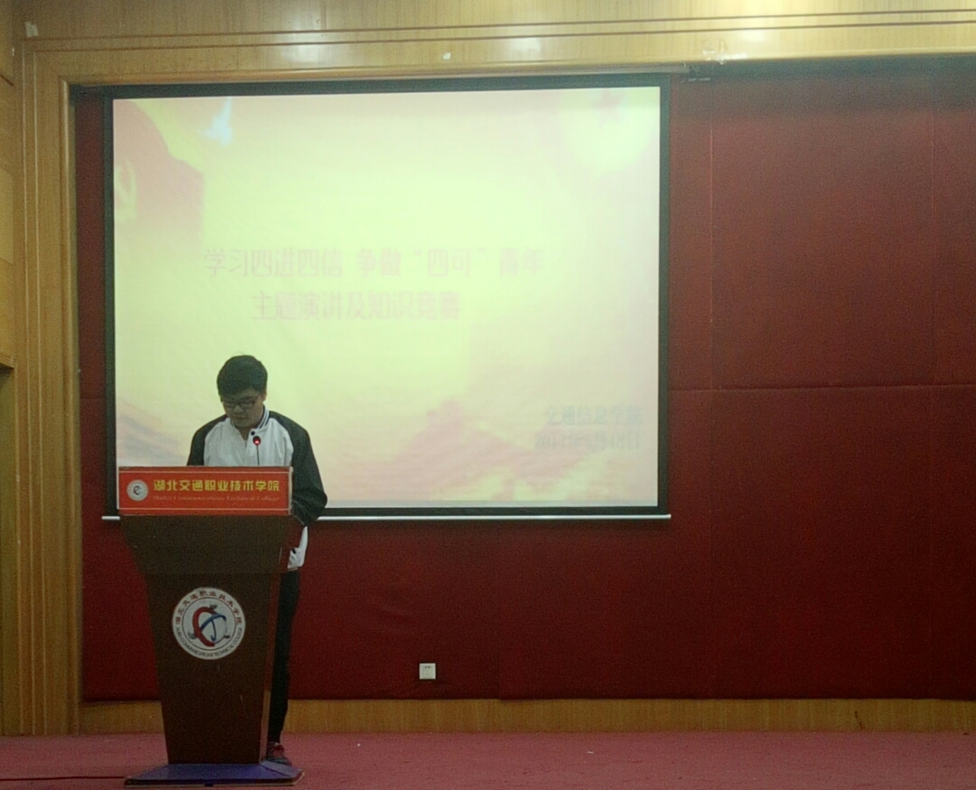 为加强思想政治引领工作,深入贯彻落实习习近平总书记系列重要讲话精神,交通信息学院分团委组织16级各团支部于5月22日在A楼五楼学术报告厅开展学习“四进四信”演讲及知识竞赛活动,交通信息学院分团委书记刘桥参加了此次会议。