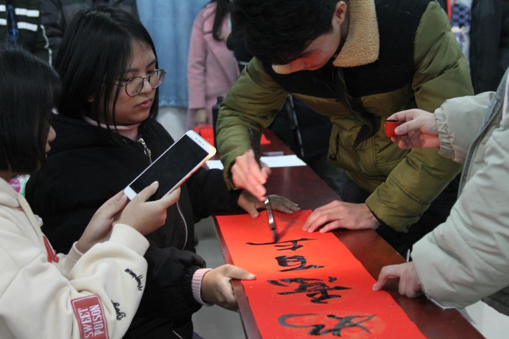来自城市轨道交通机电技术专业的马祖贵同学向记者说道:“我从小就爱好写书法,学校虽没有开设书法课,但经常会举办一些书法活动,‘迎新年 送祝福’活动,不仅为全校师生们送来满满的祝福,也有助于提升学生的书法功力。”活动相关负责人介绍,他们后期将在校内举办春联的活动,为我校教职工、学生送去新年祝福。(摄影/张嘉铖 朱伊凡)