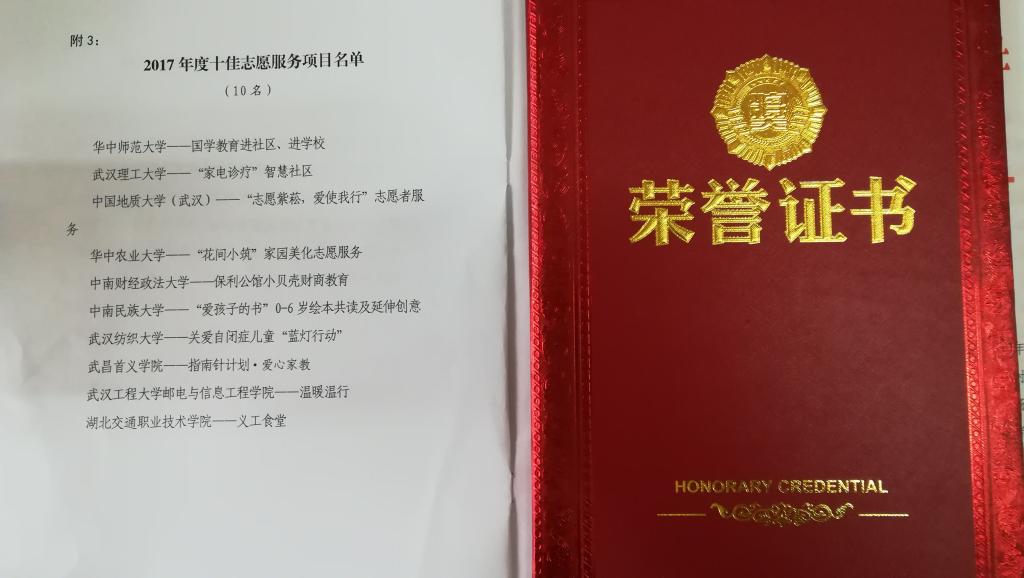 2018年3月5日,是第55个学雷锋日,也是第19个“中国青年志愿者服务日,在洪山区政府会议中心,我校交通信息学院春雨志愿服务队义工食堂志愿服务项目荣获洪山区2017年度 “十佳志愿服务项目”的荣誉称号,该项目是我校青年志愿者持续服务一年多时间,曾受到省委宣传部副部长喻立平“点赞”的重点志愿服务项目,也是本次获奖的唯一高职院校志愿服务项目。