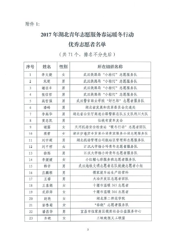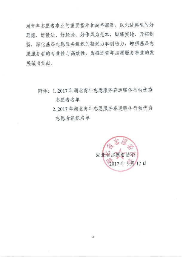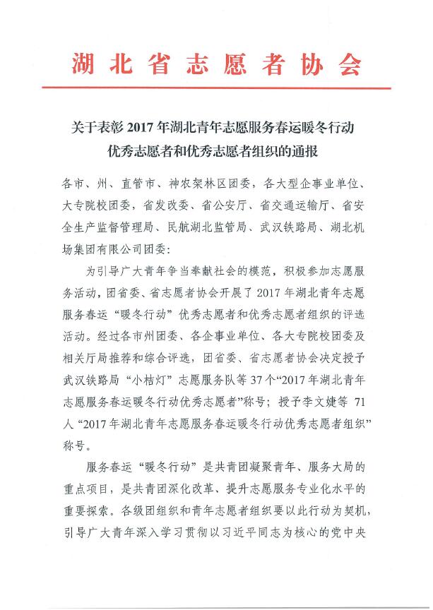 我院15级徐广同学被湖北省志愿者协会授予“2017年湖北青年志愿服务春运暖冬行动优秀志愿者”荣誉称号。