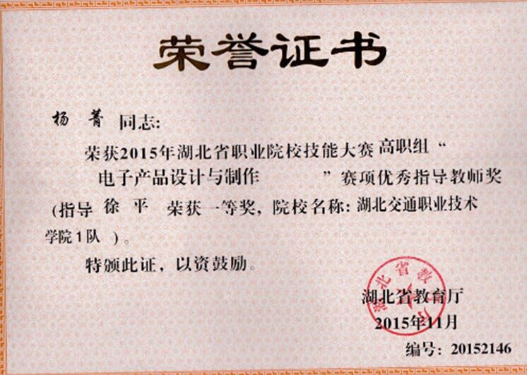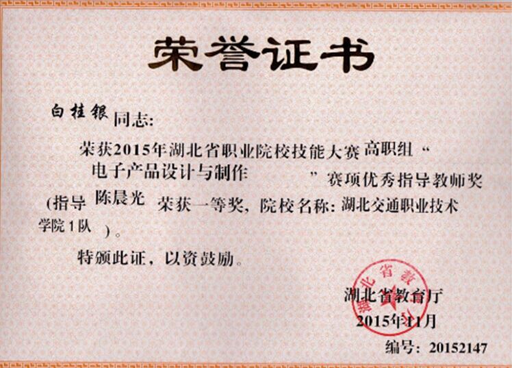 2015年11月20日,交通信息学院白桂银、杨菁两位老师指导的学生参加湖北省教育厅主办的“电子产品设计与制作”大赛,荣获一等奖的好成绩,两位老师被授予优秀指导教师。